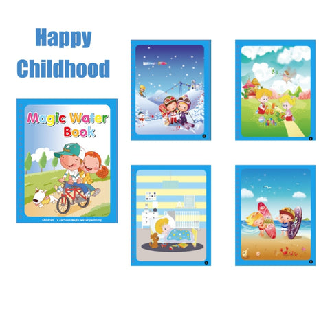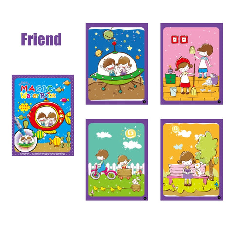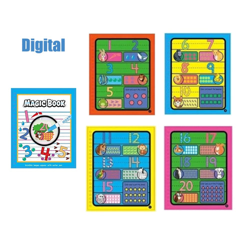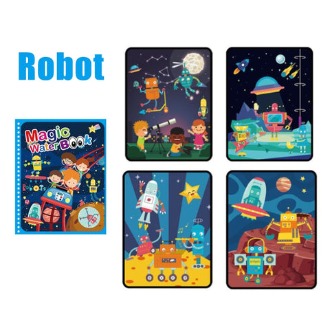 Cada livro possui 4 páginas reutilizáveis ​​e uma caneta de água recarregável.